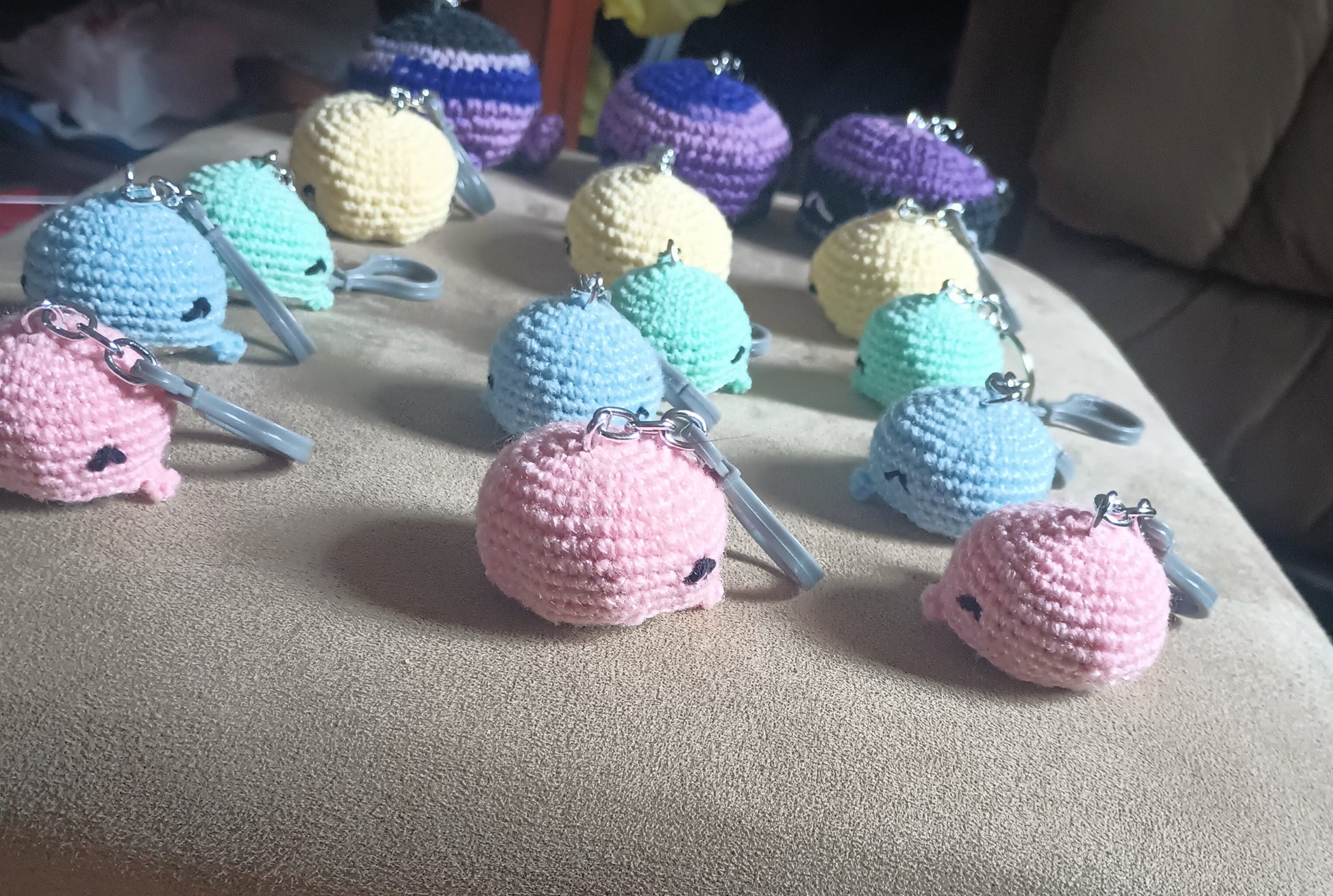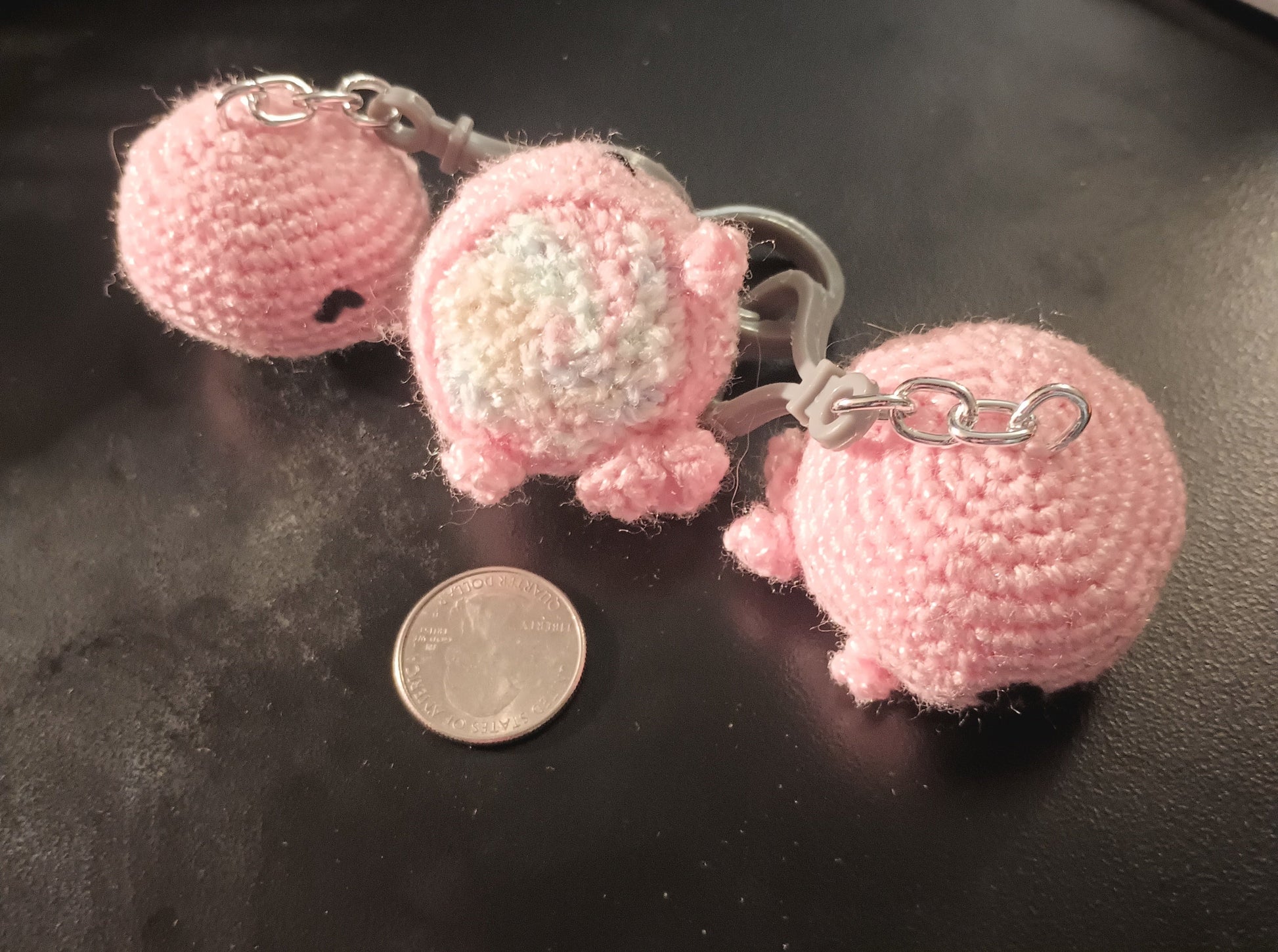 Baby-weight yarns are used for the smaller whales, thicker yarn used for the big whales. Each are just the right size for a backpack, purse or key companion! Small whales are slightly wider than a US quarter.